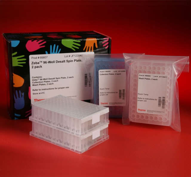 De même, les plaques de dessalage Zeba (seuil de rétention des molécules de 7 000) sont des dispositifs en polypropylène qui contiennent de la résine haute performance Zeba et offrent d’excellentes performances de dessalage des protéines, avec une récupération élevée des protéines > 7 000 Da dans un format pour centrifugeuse pour de petits volumes d’échantillons. Les plaques permettent une reproductibilité rapide et uniforme, de puits à puits et de plaques à plaques pour des séparations à haut débit et à petite échelle. Les plaques de dessalage par centrifugation à 96 puits Zeba ne nécessitent aucun ajout de résine ni aucune hydratation et offrent la même récupération élevée de protéines que les colonnes de centrifugation avec au moins 95 % d’élimination des sels et autres petites molécules. Une plaque peut traiter 96 petits volumes d’échantillons (20 à 100 µl) en seulement cinq minutes, offrant ainsi un dessalage rapide et exceptionnel des protéines.