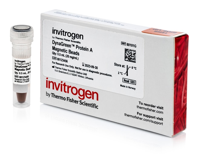 DynaGreen Protein A Magnetic Beads are intended for use in immunoprecipitation (IP) applications while also being an environmentally sustainable choice. They are microplastic-free submicron magnetic beads that provide reproducible isolation of target proteins in a simple and efficient workflow, which can be performed manually or automated on KingFisher™ instruments.