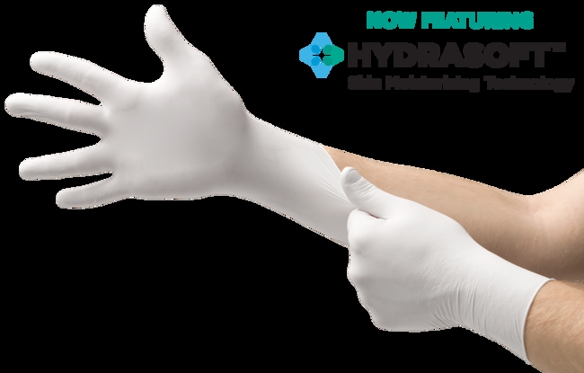 White nitrile exam gloves designed with HYDRASOFT™ Skin Moisturizing Technology to keep away dryness during medical procedures.