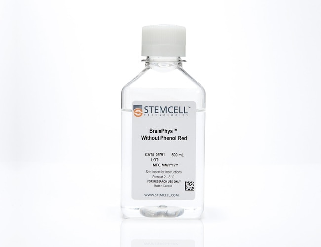 To ensure cell survival in long-term serum-free culture, BrainPhys Without Phenol Red must be combined with an appropriate serum-replacement supplement, such as NeuroCult SM1 Neuronal Supplement (Catalog #05711) and/or N2 Supplement-A (Catalog #07152)